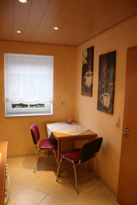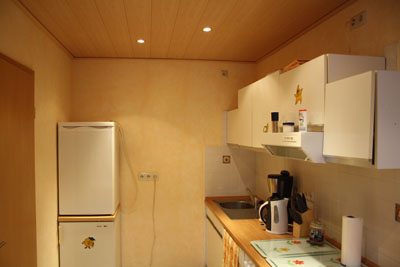 Die kleine Wohnküche ist ausgestattet mit Herd incl. Backofen und Ceranfeld, Dunstabzugshaube, Kühlschrank, Gefrierschrank, Mikrowelle, Kaffeemaschine, Wasserkocher und einer Spülmaschine. Ein Kinderhochstuhl ist vorhanden.